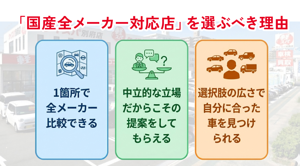 「国産全メーカー対応店」を選ぶべき理由は、以下の3つです。